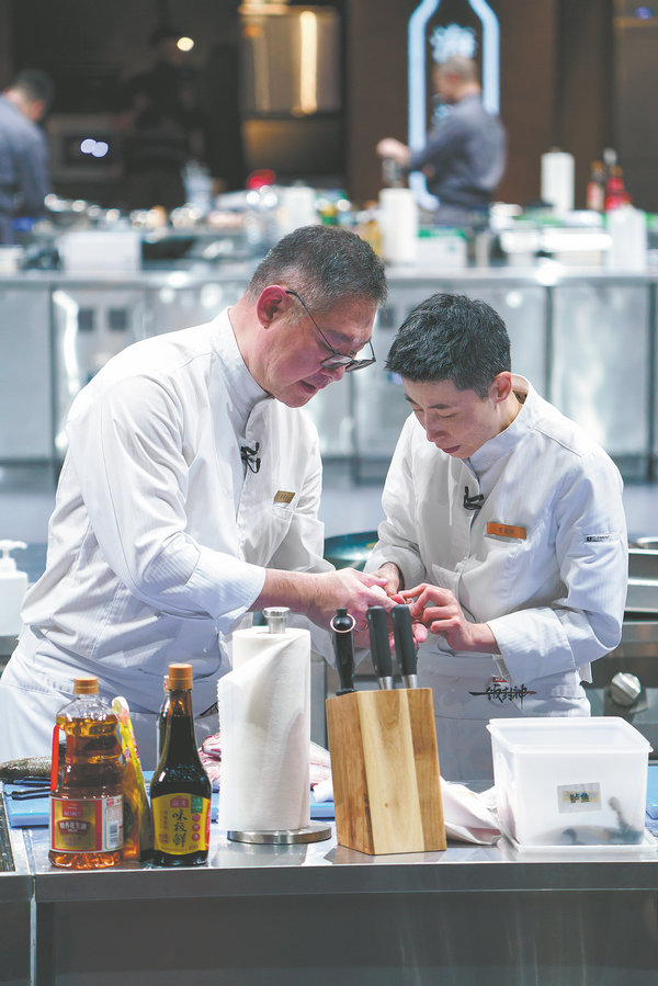 Chef David Lai (top left) cooks alongside other chefs during various team challenges on the reality show Chef of China. With his culinary artistry, down-to-earth philosophy and seasonal ingredients, Lai stood out on the show, winning the admiration of many viewers and online fans. [Photo provided to China Daily]