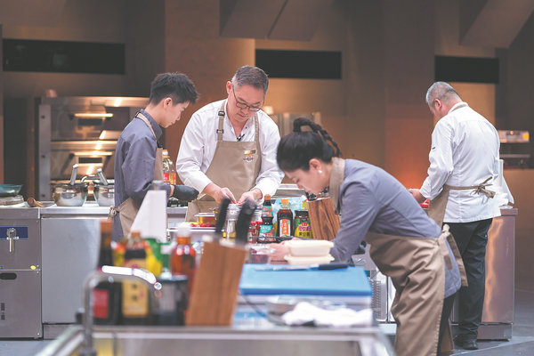 Chef David Lai (top left) cooks alongside other chefs during various team challenges on the reality show Chef of China. With his culinary artistry, down-to-earth philosophy and seasonal ingredients, Lai stood out on the show, winning the admiration of many viewers and online fans. [Photo provided to China Daily]