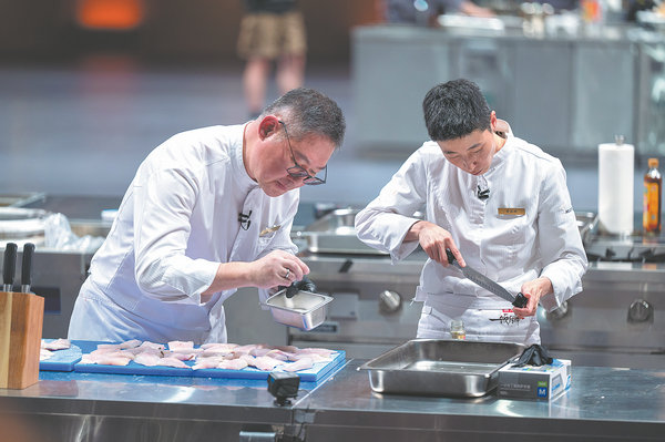 Chef David Lai (top left) cooks alongside other chefs during various team challenges on the reality show Chef of China. With his culinary artistry, down-to-earth philosophy and seasonal ingredients, Lai stood out on the show, winning the admiration of many viewers and online fans. [Photo provided to China Daily]