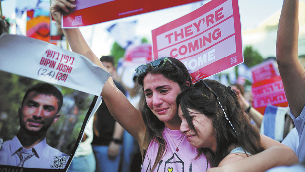 Israelis cry in Tel Aviv on Monday as Hamas releases hostages. SHIR TOREM/REUTERS