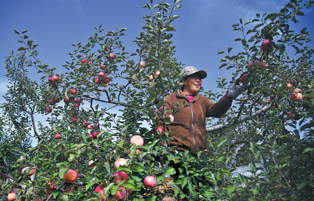 A farmer harvests apples at an orchard in Zhaoshipan in Yulin, Shaanxi province, on Nov 4. ZHANG BOWEN/XINHUA