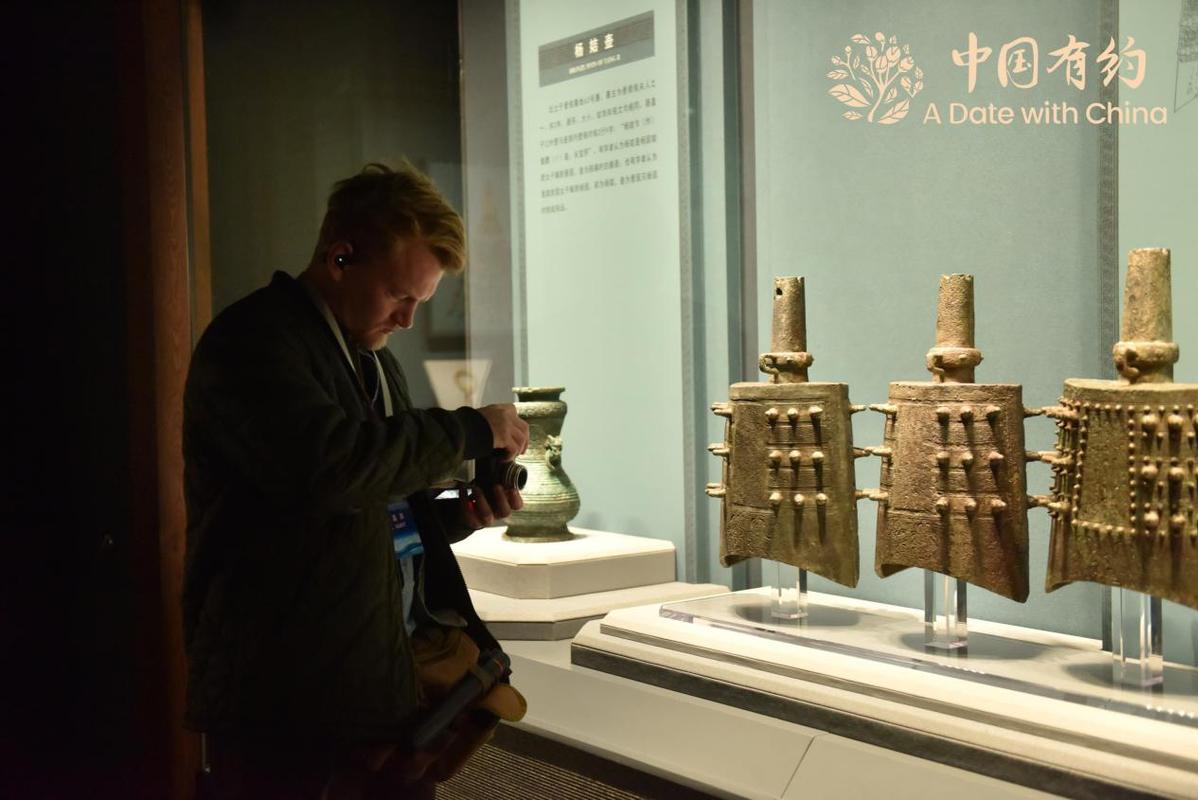 An American expert takes photos of the ancient chime bells at Shanxi Museum in Taiyuan, North China's Shanxi province, on Nov 14, 2025. [Photo/chinadaily.com.cn]