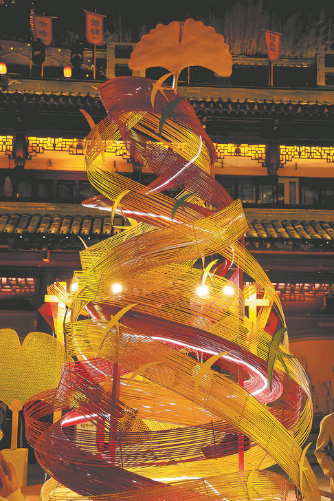 Xiao Yao, the 31-year-old inheritor of the Daoming bamboo-weaving craft, leads the design and setup of the impressive installation. Decorated with golden ginkgo leaves, the woven bamboo is painted in gold and red, flowing over the roofs of historical buildings across Yuyuan.