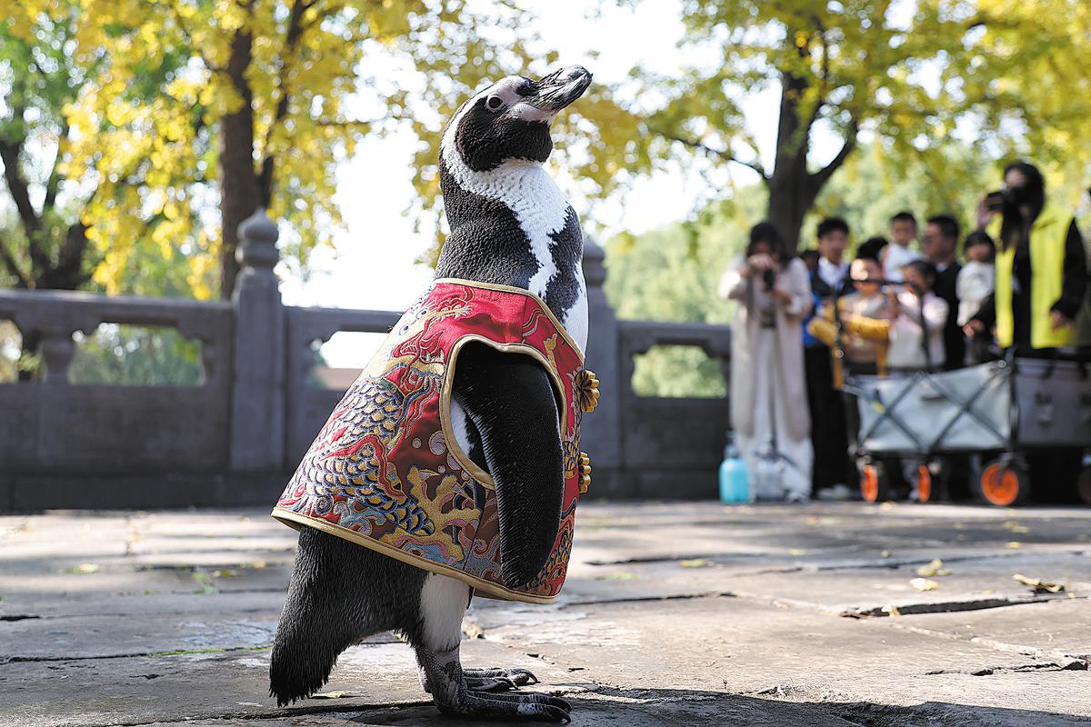 A Humboldt penguin, wearing a traditional Chinese jacket, walks in the Chaotian Palace in Nanjing, the capital of Jiangsu province, on Nov 15, 2025. Since birth, the penguin has often been taken outdoors by its keepers at the Nanjing Andover Under Water World to play whenever conditions are suitable. YANG BO/CHINA NEWS SERVICE