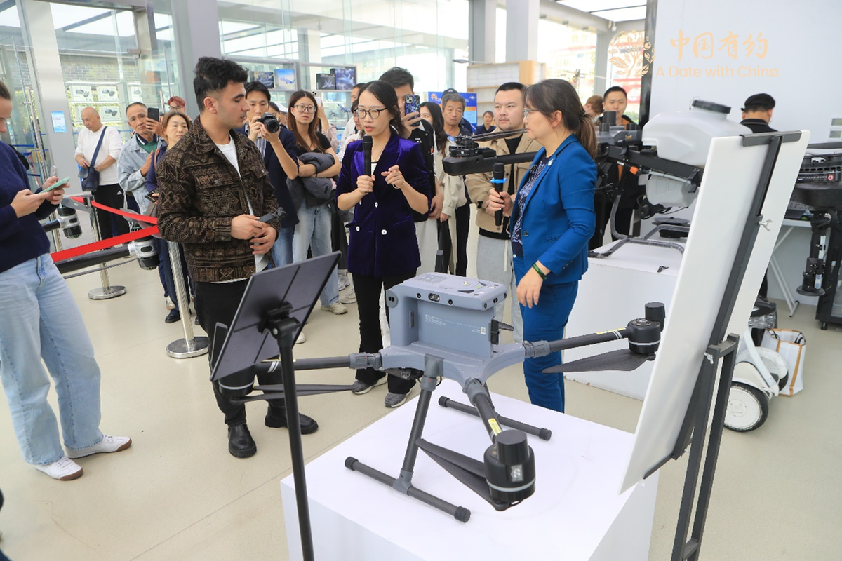 Staff members introduce the unmanned aerial vehicle to participants on the 2025 "A date with China" international media tour at "Futian Wings" Pengcheng Low-altitude UAV Exhibition Center in Shenzhen, Guangdong province, on Nov 27, 2025. [Photo/chinadaily.com.cn]