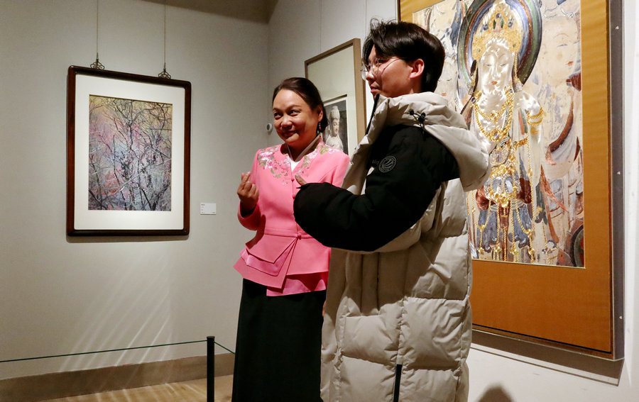 Zou Yingzi (left) poses with a visitor at the exhibition. [Photo by Jiang Dong/China Daily]