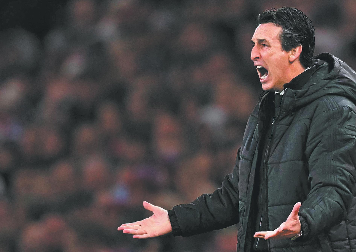 Aston Villa's Spanish manager Unai Emery gestures from the touchline during the English Premier League match between Aston Villa and Manchester United at Villa Park in Birmingham, central England, on Sunday. Villa defeated United 2-1 to move to third in the standings. AFP