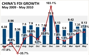 The amount of foreign direct investment (FDI) into China in May rose by 27.48 percent year-on-year to $8.13 billion.