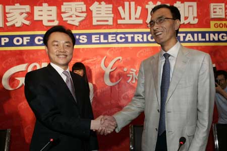 Gome chief executive officer Huang Guangyu (L), and China Paradise chairman Chen Xiao, shake hands during a news conference in Beijing on July 25, 2006. [Reuters]