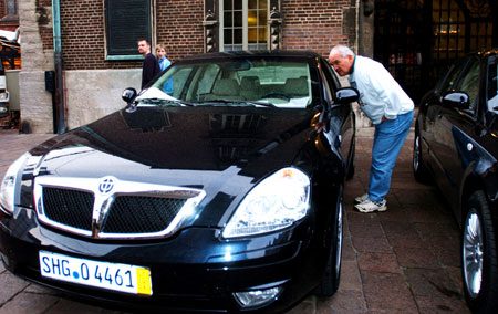 A man looks at a Brilliance China sedan in Germany's Bremen. The Chinese automaker said it has clinched a deal with Germany's HSO Motors Europe to sell 158,000 own-brand sedans on the European market. [Xinhua]