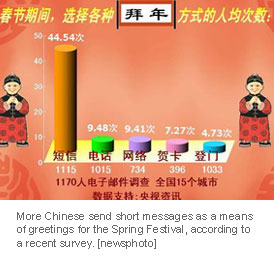 Telecommunications operators are happy to be busy helping send out the short messages, which brought about an income of 1.2 billion yuan (154 million US dollars) for them during the last Spring Festival. The latest statistics show that by the end of November 2006, China's mobile phone subscribers had reached 455 million, and the number of short messages during the festival is expected to surpass the same period last year by a big margin. (For more biz stories, please visit Industry Updates)