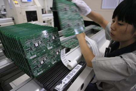 A labourer works on television electronic parts at a factory in Nanjing, east China's Jiangsu province, May 17, 2007. Annual growth in Chinese fixed-asset investment picked up to 25.5 percent in the first four months of the year, reinforcing expectations of further policy tightening to slow the world's fourth-largest economy. [Reuters]