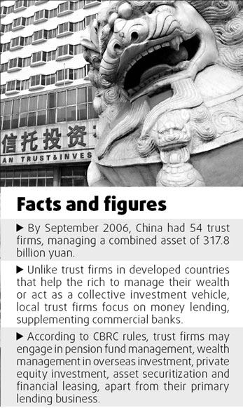 Though the Trust Law enacted in October 2001 provided a clearer definition of the term "trust", the industry calls for more regulations. The CBRC is moving quickly to define the scope of trust companies' investment and depository mandates. The CBRC introduced two rules in February and April to guide trust firms in developing new businesses. According to these rules, trust firms may engage in pension fund management, wealth management in overseas investment, private equity investment, asset securitization and financial leasing, apart from their primary lending business. "This will lead to a restructuring of the trust industry. Some poor performers may be kicked out of the business as a result," said an industry insider from Yunnan International Trust & Investment Co Ltd. (For more biz stories, please visit Industry Updates)