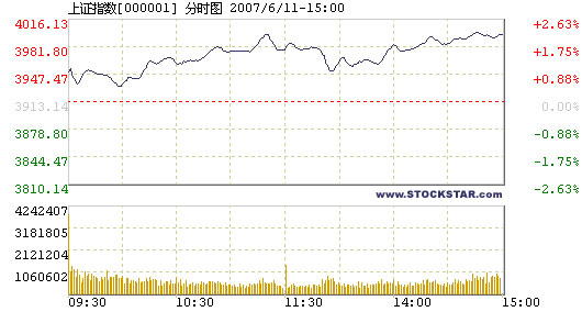 Stocks move closer to 4,000-point markBy Li Zengxin (chinadaily.com.cn)Updated: 2007-06-11 15:44 After Friday's adjustments, Chinese stocks laddered up toward the 4,000-point psychological mark today. The Shanghai Composite Index closed at 3,995.68, up 82.55 points or 2.11 percent from previous closing. Opening higher from 3,942.01, the index headed north for most of the day, fluctuating within a range from 3,930.74 to 4,000.42, both higher than the closing on Friday. Although passing the milestone 4,000 mark for once, it failed to stick to that point untill the end. Shanghai Composite