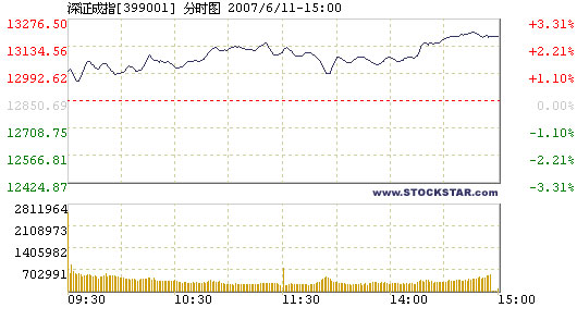 China Unicom, with the largest trading volume, rose 0.26 yuan, and Sinopec, with the largest transaction value, added 0.36 yuan to its share price. The hikes of the duo lifted the whole market. The Shenzhen Component Index, tracking the smaller Shenzhen Stock Exchange, closed at 13,187.71, up 337.03 points or 2.62 percent. It went through the day with a range from 12,938.27 to 13,208.97. Shenzhen Component