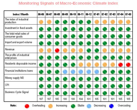 Macro economic climate index stable in MayBy Shangguan Zhoudong (chinadaily.com.cn)Updated: 2007-07-03 11:09 Statistics from the NBS show that According to the country's monitoring signals of macro economic climate index