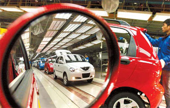 A Chery Automobile production line. The company clinched a landmark deal with major US auto company Chrysler yesterday. [Xinhua]