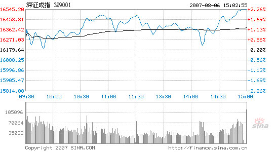 Updated: 2007-08-06 16:26 Chinese stocks remained strong and struck new records today, with the Shanghai Composite Index adding up another 67.33 points to 4,628.11, 1.48 percent higher than last Friday's record. Unlike last Friday, when a few heavyweight stocks rose moderately to lift the whole market, today prices of a large portion of the total stocks rose. On the two exchanges, a total 997 stocks went up today. Total turnover of stocks enclosed by the two major indices was 259.4 billion yuan, slightly lower than that of last Friday. Shanghai Composite Index ![]() The Shanghai Composite Index started at the 4,600-point level right at the opening, a 40 point jump from the previous closing. During the day, it went through a few short-ranged fluctuations, but none of the drops brought it below the last close, with a low of 4,564.31. Finally, it closed just a little below the daily high of 4,629.97. Of the A shares listed on the Shanghai bourse, 593 closed up while 190 slipped and 59 finished unchanged. CEC Corecast Corp led a total of 24 stocks to rise at least 10 percent, the maximum movement cap for stocks on a single-day trading. Chengdu Yangzhiguang Industrial, suspected of misconduct for information disclosure in their directed placement process for additional shares, however, lost 9.6 percent to finish the day on the bottom. The Industrial and Commercial Bank of China, with the largest trading volume, failed to repeat last Friday's 5 percent growth today, but dropped 0.34 percent to 5.8 yuan. China Minsheng Banking Corp, with the largest transaction value, continued a bull run, with its share price gaining 0.11 yuan. Shenzhen Component Index ![]() The Shenzhen Component Index, tracking the smaller Shenzhen Stock Exchange, rose 363.17 or 2.24 percent to 16,542.81. Opening higher from 16296.96, it went through the day in a range between 16,189.99 and 16,542.81, both higher than the previous close. Of the A shares, 409 went up, 133 slipped, and 78 closed flat. Jiangsu Sihuan Bioengineering was up 10.08 percent as the biggest gainer while Shahe Industry lost 6.92 percent on the other end of the table. The largest trader, China Vanke, added 0.17 yuan to its share price. |