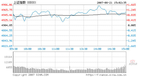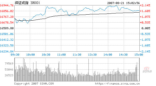 Updated: 2007-08-21 17:09 After yesterday's 5.33 percnet leap, the largest single-day growth in two years, Chinese stocks continued marching toward the critical 5,000-point zone today. The Shanghai Composite Index closed 50.35 points or 1.03 percent higher at 4,955.21, surpassing the previous record highs. Total turnover of the stocks in the major indices was 242.1 billion yuan, the largest in a week. Shanghai Composite Index The benchmark Shanghai Composite Index opened higher at 4,944.21 and remained above yesterday's closing level through a few short-ranged swings. It hit its low of 4,917.82 around noon and the highest 4,982.98 in the mid of the afternoon session. Shenzhen Component Index ![]() The Shenzhen Component Index, tracking the smaller Shenzhen Stock Exchange, finished at a new record high of 16,859.97, up 270.71 points or 1.63 percent than yesterday's close. It went through the day in a range of between 16,661.83 and 16,939.45, both above the pervious closing figure. Of the A shares listed in the two exchanges, 775 went up, including 30 of them sealed at the maximum growth cap of 10 percent, while 580 dropped and 143 ended unchanged. Stocks in the non-ferrous metals, pharmaceutical and wholesale and retail industries led the surge, while financial shares including the Industrial and Commercial Bank of China and China Minsheng Banking Corp contributed most to the index rise. Meanwhile, China has approved individual investors for direct investment overseas in certain designated areas. Investors can use their foreign exchange or purchase foreign currency to open an account with Bank of China's Tianjin branch or Bank of China International Securities in Hong Kong, according to a statement by the State Administration of Foreign Exchange on its website yesterday. The investment amount will not be subject to the annual limit of US$50,000 for individuals who purchase foreign exchange. Analysts believe the move is intended to address the excessive liquidity problem and release pressures for the yuan's appreciation. Industrial experts believe the new policy, when expanded to a larger extent in the country, may help divert some of the floating capital out of the red-hot A-share market, reducing volatility. On the other hand, however, the slow-down of red chips returning to the home market limits capital to outgoing channels, said analysts. Red-chip companies including China Mobile and China Overseas Land & Investment Ltd have said they were postponing the return.
