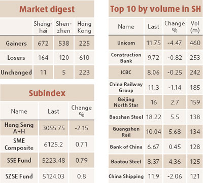 Updated: 2008-01-04 09:07 China's main stock index rose to a six-week closing high yesterday and turnover expanded to levels last seen near the market's peak, as second-tier industrial shares soared while financials stayed weak. The Shanghai Composite Index ended up 0.89 percent at 5319.861 points, less than two points off its intra-day high. It was the highest close since November 15. Turnover in Shanghai A shares rose to a heavy 169.6 billion yuan ($23.33 billion), the highest level since mid-October, when the index hit its all-time peak of 6124 points. Wednesday's turnover was 132.4 billion yuan. "Sentiment is strong and investors are buying a wide range of shares," said Zhou Lin, analyst at Huatai Securities. He added that while bank shares were still being hurt by expectations of more monetary tightening in coming months, banks' profit outlook remained generally positive given the booming economy. The index has neared its 60-day moving average, now at 5354 points, which some traders consider strong technical resistance that will not break in the short term. Investors may therefore continue to focus on second- and third-tier stocks instead of blue chips, they said. But analyst Zhang Yanbin at Zheshang Securities said blue chips were also showing signs of rallying. PetroChina, the biggest stock, rose 1.64 percent to 31.08 yuan.