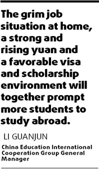 "The grim job situation at home, a strong and rising yuan and a favorable visa and scholarship environment will together prompt more students to study abroad," Li said.