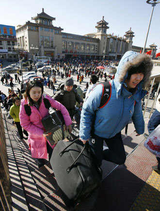 The situation was in stark contrast prior to the start of the Chinese Lunar New Year starting on February 7 when millions of people trying to get home were stranded at railway stations, airports and on the roads after heavy snow and icy rain hit the country's south. The Ministry of Railways said snow and ice storms in south China had prolonged this year's post-Spring Festival travel peak, which may last to Saturday. Another travel peak is expected on February 21 as most migrant workers will return to work after the Lantern Festival. Post-Spring Festival railway traffic peak saw more than 5 million passengers on the last day of last year's holiday and more were expected this year, a Ministry of Railways spokesperson said on Monday. More than 700 additional trains were thrown into operation by the Ministry of Railways to cope with the peak of railway traffic on Tuesday. The travel rush is also seen on the roads, with 53.28 million journeys expected to be made on Tuesday. All the roads linking different provinces have resumed traffic and there is no vehicles stranded on the national artery linking Beijing and Zhuhai City of Guangdong, which was paralyzed by the snow before the holiday. |