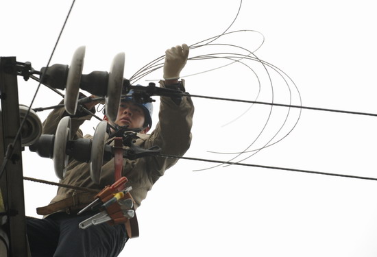 A worker is repairing power transmission lines in the southwestern Guizhou Province Sunday. As of February 16, the Southern Power Grid has lifted 23.28 million people from power failure caused by snowstorm. [Xinhua]