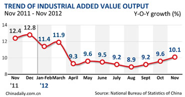 China's value-added industrial output rose 10.1 percent year on year in November, picking up from 9.6 percent in October, the National Bureau of Statistics announced Sunday.