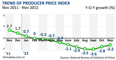 China's producer price index, which measures inflation at the wholesale level, fell 2.2 percent year on year in November, the National Bureau of Statistics said Sunday.