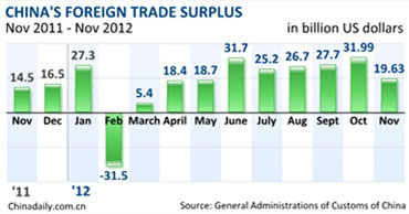 China's exports rose 2.9 percent from one year earlier in November while imports staying unchanged compared with one year ago.