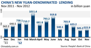 China's new yuan-denominated lending reached 522.9 billion yuan ($83 billion) in November, down 40 billion yuan year-on-year.