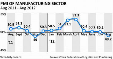 China's manufacturing activity further slid in August with the purchasing managers index standing at 49.2 percent, the lowest pace in nine months.