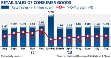 Retail sales in China rose 13.4 percent in August from a year earlier, slightly accelerating from the 13.2-percent increase in July.