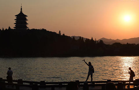 Tourists pose for photos beside Leifeng Pagoda at sunset in Hangzhou, capital of East China's Zhejiang province, Aug 29, 2016.