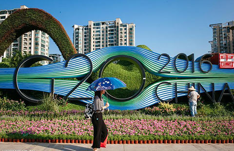 A gardener maintains a G20 themed flower terrace at Jiangnan Avenue in Binjiang district of Hangzhou, capital of East China's Zhejiang province, Aug 25, 2016.