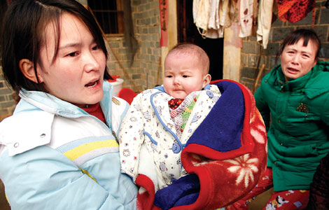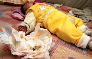Photo takes on Dec 21, 2010 shows a baby sleeping near a used diaper in which five pieces of blades were found, in Nanzhuang county, South China's Guangdong province.