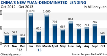 China's new yuan-denominated loans in October came to 506.1 billion yuan ($82.44 billion), an increase of 700 million yuan from the same period last year.