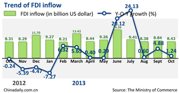 China's foreign direct investment in October went up 1.2 percent from a year earlier to $8.4 billion, the Ministry of Commerce said Tuesday.