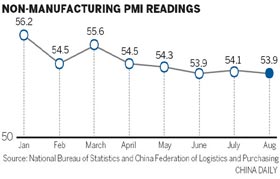Non-manufacturing business activity moderated in China last month, with the Purchasing Managers' Index coming in at 53.9, down from 54.1 in July.