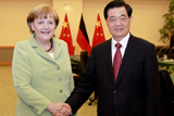 Chinese President Hu Jintao met with German Chancellor Angela Merkel Monday morning in the Mexican resort of Los Cabos prior to the opening of the G20 summit in the afternoon.