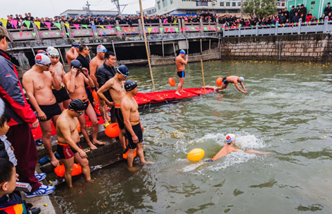 A group of swimmers, braving chilly conditions, jumped into the Donghe River in Rui'an, Zhejiang province, on Monday.