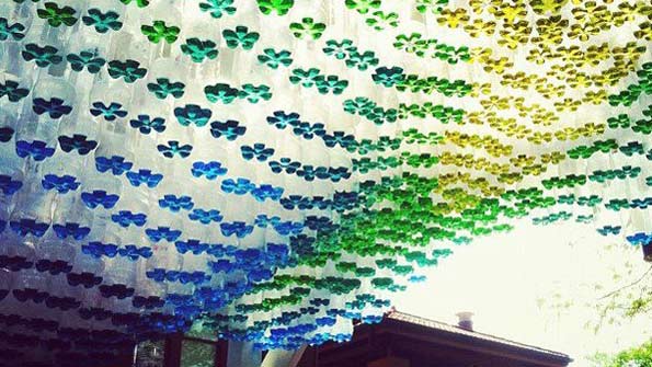 Designer Garth Britzman of Lincoln, Nebraska used recycled bottles filled with colored water to create stunning topographical shade canopy for a vehicle.