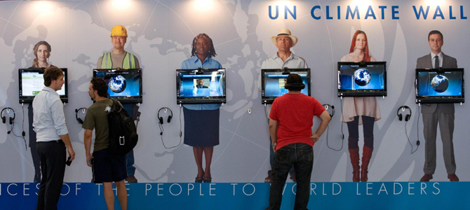 Visitors look at the UN Climate Wall, a photo exhibition, during the United Nations Climate Change Conference in Cancun, a resort city in Mexico, Dec 1, 2010. The talks, from Nov 29 to Dec 10, are being held to continue to search for solutions to the climate problem. About 25,000 participants from 194 countries gathered in Cancun for the conference.
