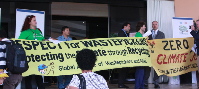 Global Alliance of Waste Pickers and Allies members from India, South Africa and Latin America hold a protest on Dec 1 at the Moon Palace, a major venue for the United Nations' climate change conference in Cancun, Mexico. They called for countries to recycle waste and respect waste pickers.