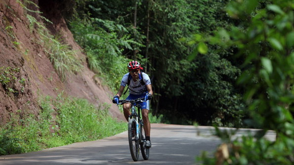 Local cycling enthusiasts test a bike trail in the woods in Huolu county, Wulong, Chongqing municipality. The are will host the Wulong Mountain Quest 2011 on Sept 1, 2011.