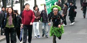 Chen Jun, a long-distance runner who shaved his head, wearing a green leafy hat and skirt, runs on the Bai Causeway (Bai Di) of West Lake in Hangzhou, East China, on Nov 16. Carrying a flag with a "low carbon” message, he said he planned to run around the lake for 15 days until the end of this month, calling on more people in Hangzhou to adopt low-carbon living.