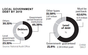 Local governments had an overall debt of 10.7 trillion yuan ($1.65 trillion) by the end of 2010, said China's top auditor on Monday in a report to the National People's Congress.