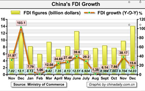 The amount of foreign direct investment (FDI) into China rose 17.4 percent year-on-year to $105.74 billion last year, said Yao Jian, spokesman of the Ministry of Commerce, Tuesday.