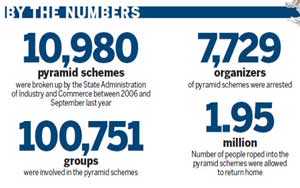 According to the State Administration of Industry and Commerce (SAIC), between 2006 and September last year, it was responsible for identifying and breaking up 10,980 pyramid schemes.
