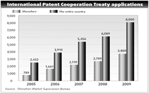 As they now eye overseas markets, Shenzhen-based companies filed 3,800 international Patent Cooperation Treaty (PCT) applications in 2009, nearly 45 percent of the country's total.